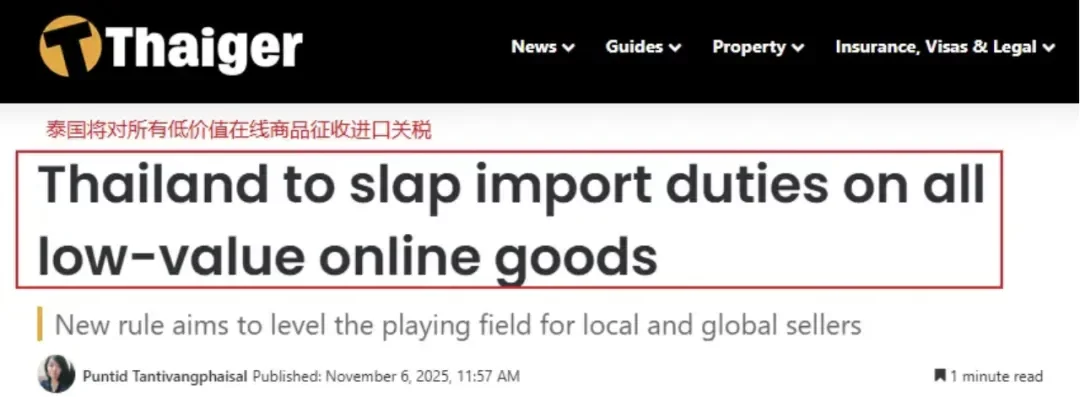 2025年11月,泰国海关总署的一纸公告,宣告了这个东南亚电商重量级市场即将全面取消进口免税政策。自2026年1月1日起,所有进入泰国的商品都将被征收进口关税,这意味着泰国正式加入了全球跨境税收收紧的行列。